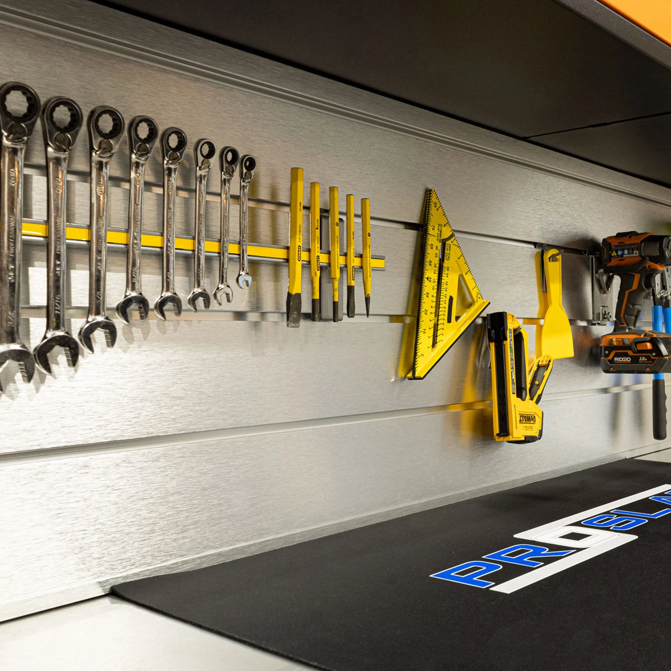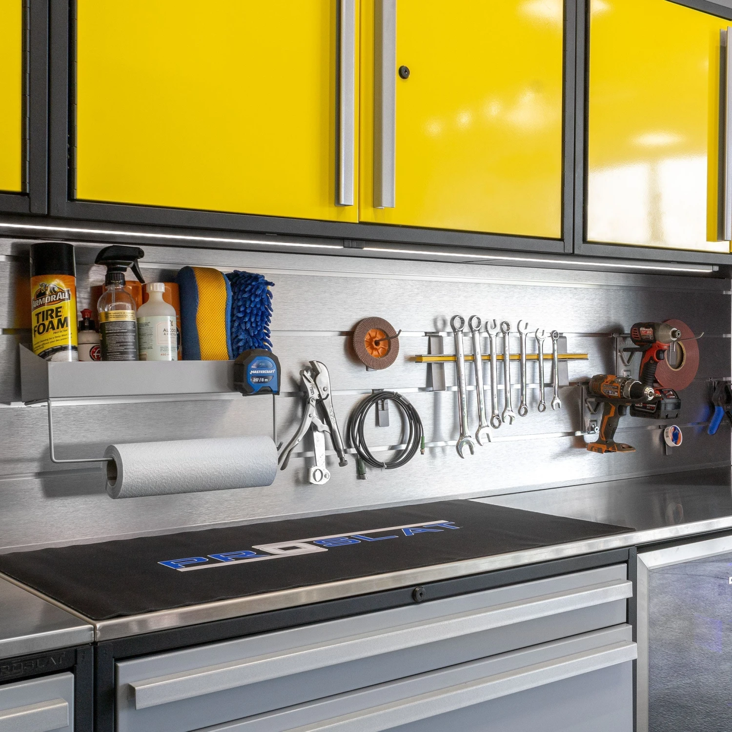 Complete your cabinet set with our Aluminum Backsplash – when only the best will do. The Proslat aluminum Slatwall comes precut to fit your cabinets. This is a great accessory for a sleek finished look. Upgrade your backsplash with our handy backsplash hook kit (sold separately) which enables you to store your most frequently used tool at an arm’s reach.