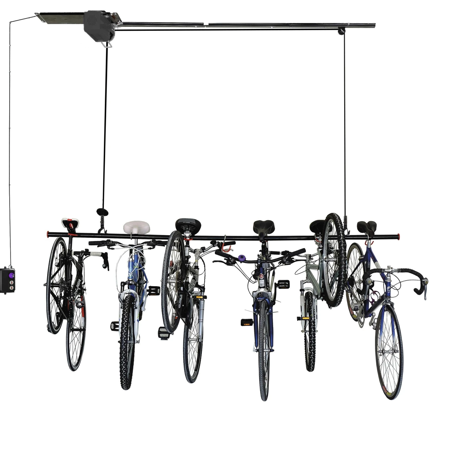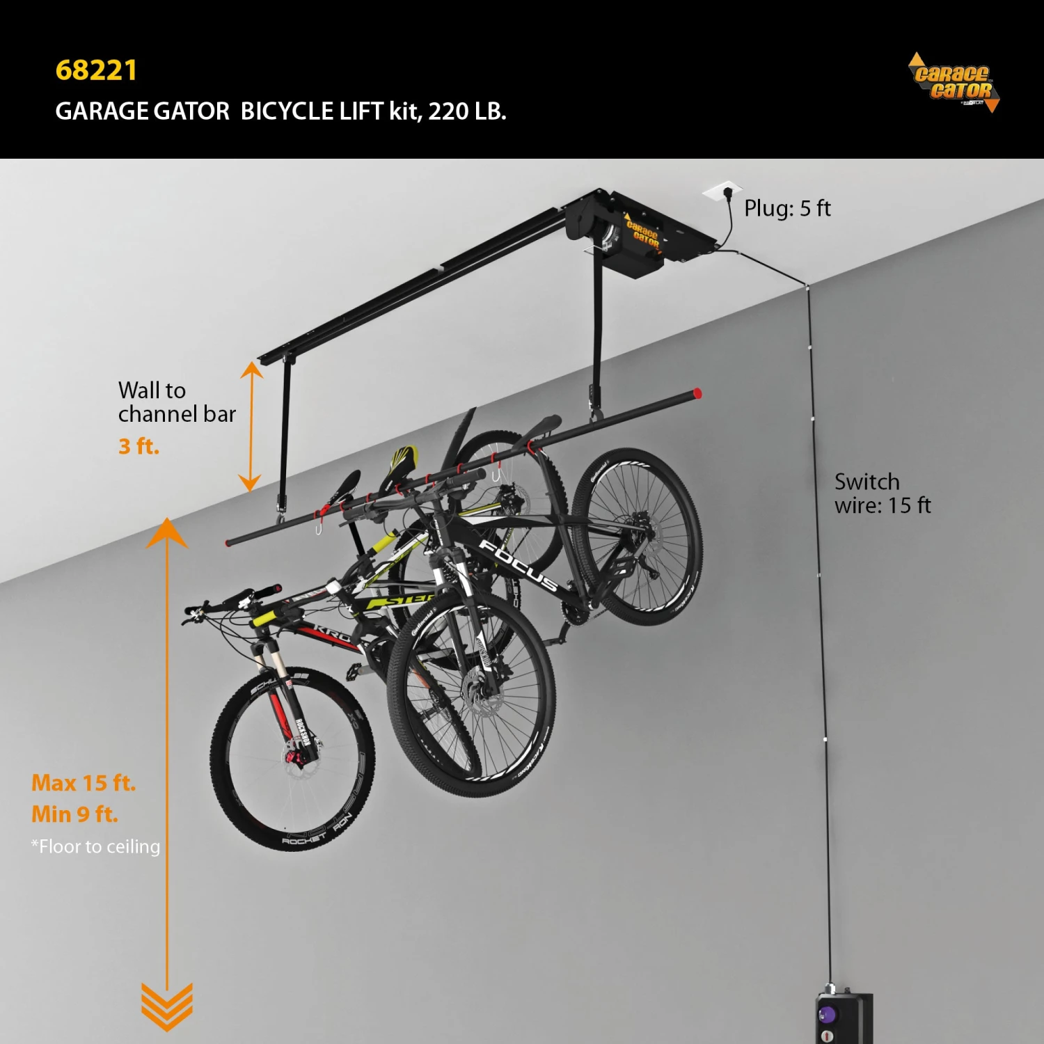 No more climbing ladders to store your bikes away, let the Garage Gator Eight Bicycle lift take the strain out of heavy lifting and organizing. Easy to install and even easier to use. The Garage Gator lift lowers to ground level so you can attach your bikes and golf bags, and then with a click of a button get them up and out of the way.