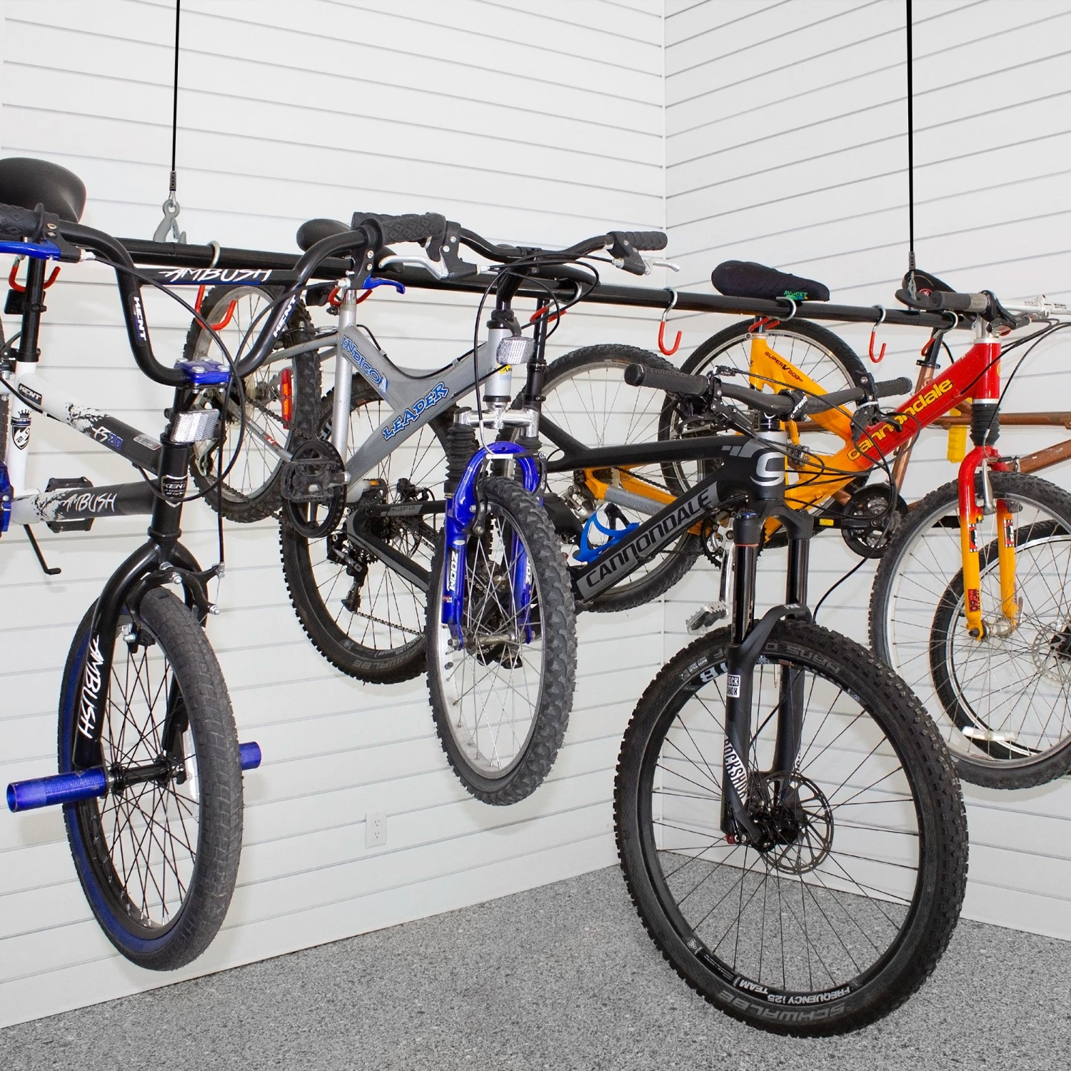 Maximize your floor space and take the heavy lifting out of overhead storage and organization. The Proslat Garage Gator lift will easily raise, secure, and store up to 8 bikes or 220 lb. of your gear.