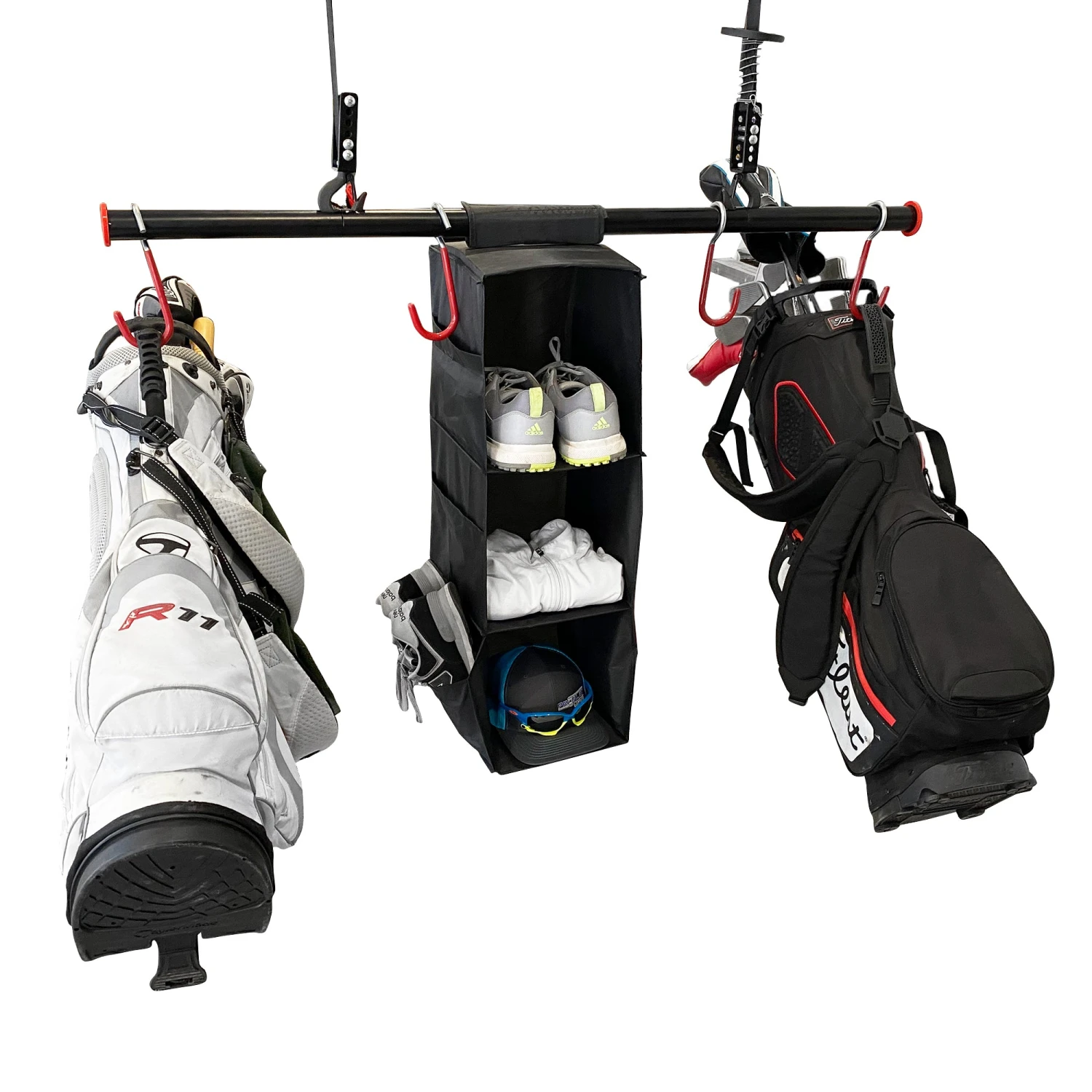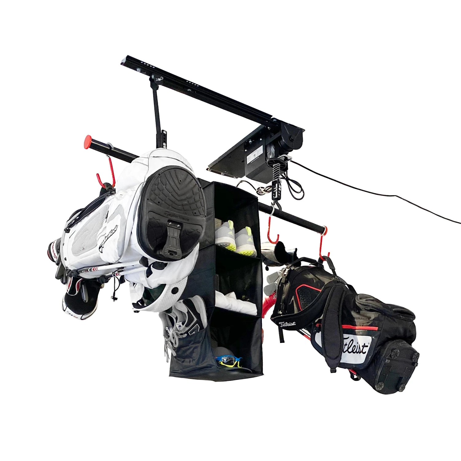 The golf lift is simple to use and with the push of a button you can access your gear; bags, shoes, balls, even bikes! The Golf lift also comes with four bike J-hooks which gives you the option of hanging bikes making this compact lift versatile for your active lifestyle.